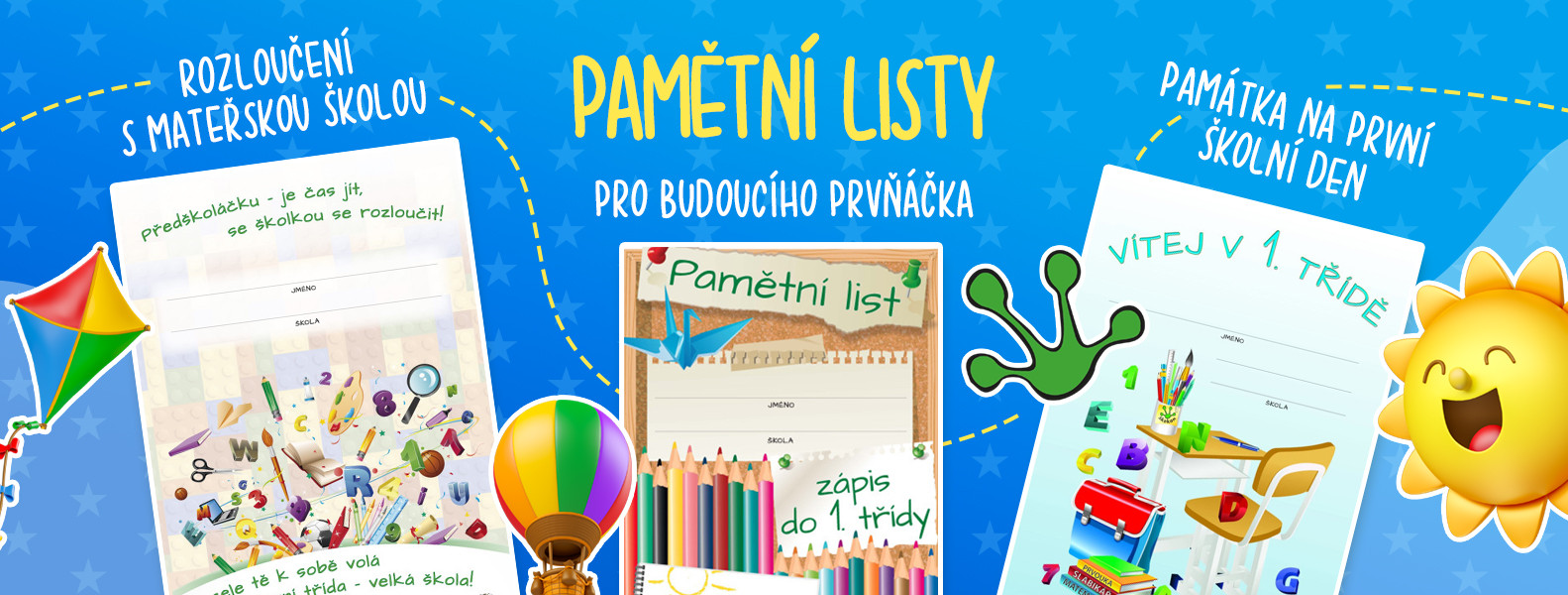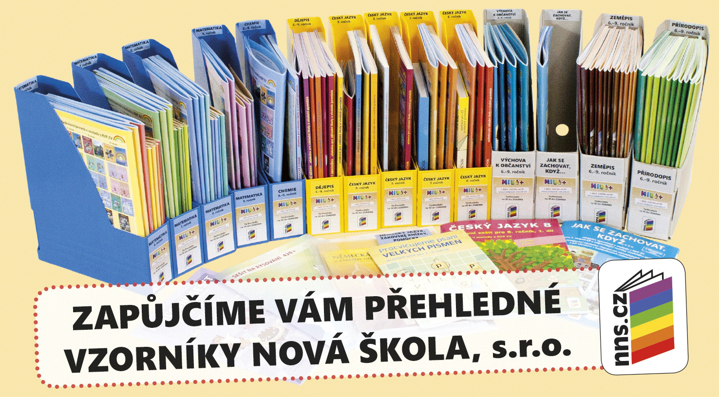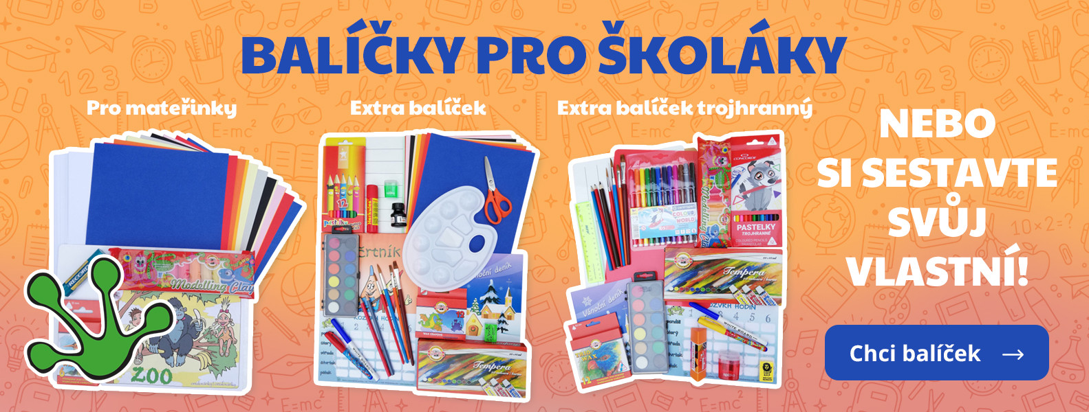 Na našem webu najdete nejen školní balíčky pro prvňáky, učebnice, pracovní sešity a další školní potřeby (např. křídy, houby, pastelky, psací potřeby a podložky, barvy, štětce, školní desky, lepidla, batohy, pouzdra, modelíny, modelovací podložky, fimo hmotu, keramické potřeby, výtvarné potřeby, ozdobné a kreativní papíry, sešity, lenochy, obaly, balicí potřeby, čtvrtky, diplomy, …), ale také nabízíme potřeby pro kanceláře a další provozovny (např. pořadače, rozřaďovače, obálky, kalendáře, nůžky, pravítka, sešívačky, děrovačky, sponky, kalkulačky, korekční potřeby, kancelářské papíry, bloky, samolepicí štítky, náčrtníky, účetní doklady, řezačky, skartovačky, laminovačky a mnohé další).