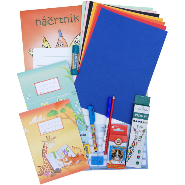 Balíček plný věcí, které malý školák potřebuje.