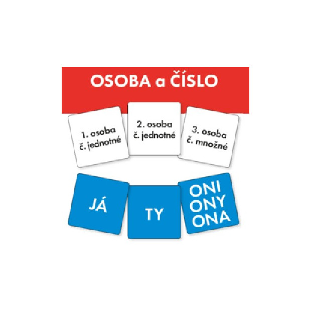 Sada obsahuje 6 karet s kombinací "1. osoba číslo jednotné" až "3. osoba číslo množné". Na druhé straně karet jsou jednotlivé osoby/čísla reprezentovány zájmeny, tj. " Já", "Ty", atd.