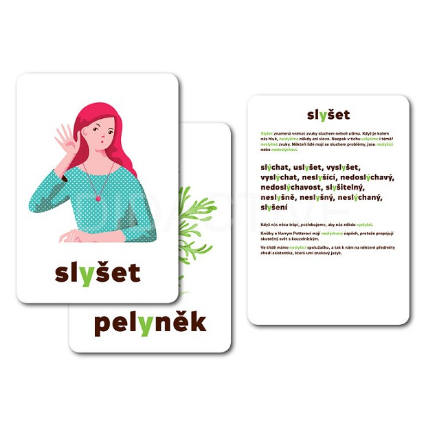 - velká ilustrace vyjmenovaného slova na jedné straně karty zapojuje vizuální paměť, text na druhé straně přibližuje význam a uvádí slova příbuzná i s příklady použití ve větách