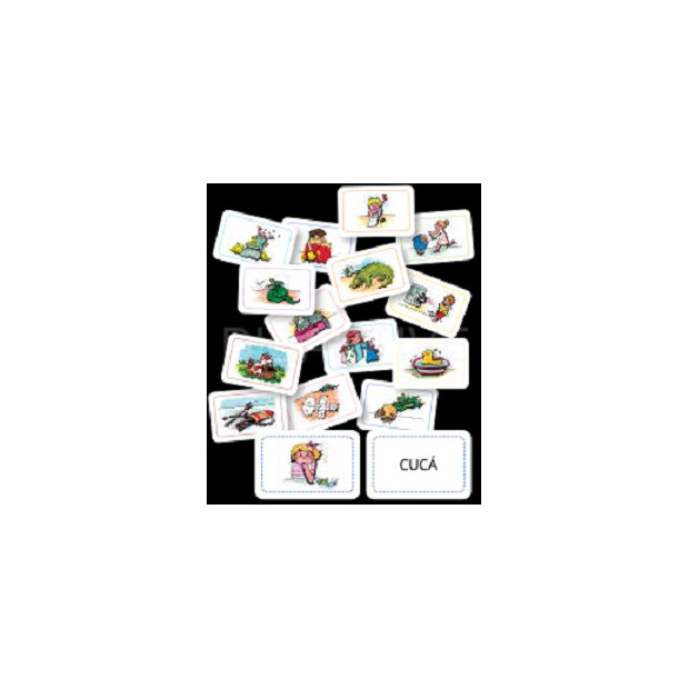 Komplet obsahuje 12 sad karet. V každé sadě je 6 karet s ilustrací a 6 karet se slovy. Na druhé straně karty s obrázkem je vytištěné správné slovo pro sebekontrolu. Pokud dítěti vyjde obrázek a slovo, které k němu od pohledu nepasuje, vrátí se ke dvojicím a hledá chybu samo. V sadách jsou občas i méně frekventovaná slova. Díky snadnému přiřazení ostatních pěti karet dítěti karta se slovem a obrázkem zbyde a dítě se tak seznámí s významem slova.