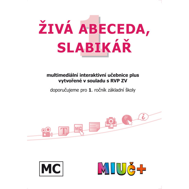 MIUč+ Živá abeceda, Slabikář (sada) tedy obsahuje interaktivní verzi tištěné Živé abecedy, interaktivní verzi tištěného Slabikáře, interaktivní verze tištěných písanek a multimédia: interaktivní cvičení, videa, mezipředmětové vztahy (prvouka Já a můj svět 1, Matýskova matematika 1, angličtina Listen and play 1, Hudební výchova 1), fotoalba, webové odkazy a audia.