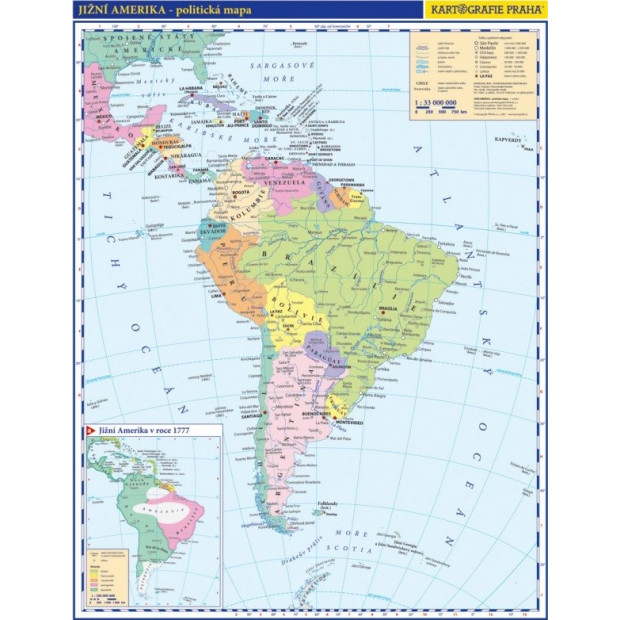 Přehledná mapa příručního formátu zobrazuje politické uspořádání Jižní Ameriky. V samostatném výřezu je mapa koloniální Jižní Ameriky z 2. poloviny 18. století. Druhá strana tradičně nabízí obrysovou mapu.