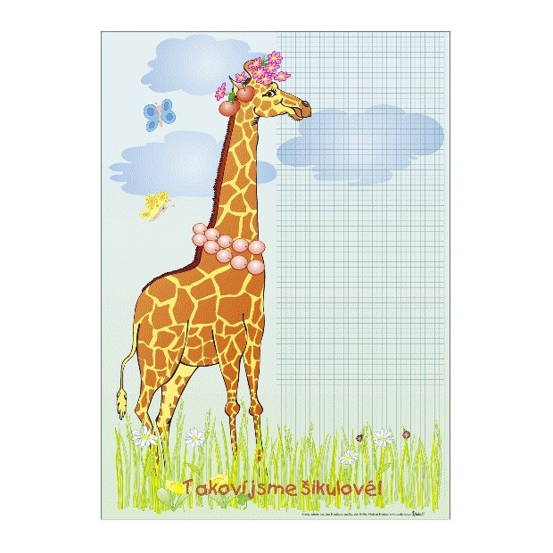 Motivační obrázek žirafy. V pravé části obrázku je tabulka, která slouží k zapisování bodů žákům. V dolní části tabulky se dopíší jména žáků (je zde 35 sloupců pro jména) a pak se za odměnu dokreslují nebo dolepují body za dobrou práci (tabulka má 69 řádků). Na obrázek lze psát lihovými fixy a vratně dolepovat běžné samolepky.