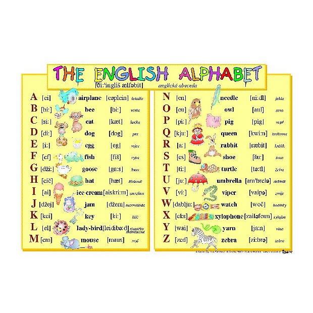 Přehled abecedy s přepisem anglické výslovnosti, slovem a obrázkem k zapamatování.