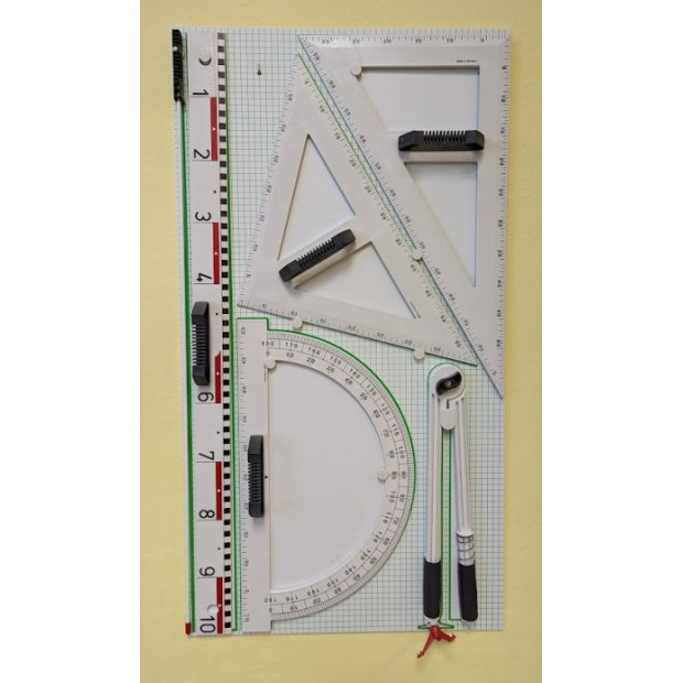 Kvalitní učitelské rýsovací potřeby na magnetickou tabuli.
