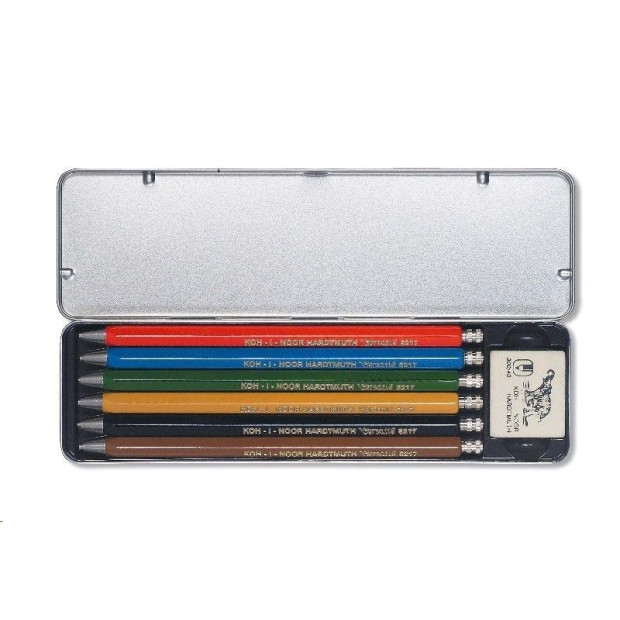 Souprava tužek mechanických padacích bez klipu v šesti barvách s odpovídajícími barevnými pastelovýmí tuhami pr. 2 mm - pastelky, barvy žlutá, zelená, modrá, červená, černá a hnědá + stěrací pryž určená pro kancelářské použití - řada office. Tuha se posunuje stisknutím knoflíku hrotítka v nakloněné poloze tužky, tím dojde k otevření kleštiny a vysunutí tuhy. Tuhy lze hrotit, hrotítko ve stiskacím knoflíku tužky. Plášť tužky kovový šestihranný 0K7 lakovaný barvou, mechanika je kovová. Baleno do plechové krabičky s okrasným štítkem na víku, tužky a pryž uloženy do tvarové vložky. Plechová krabička je zasunuta do papírové krabičky ve stejněm designu jako okrasný štítek na víku plechové krabičky.