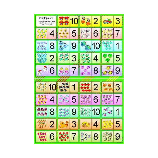 Hra je určena předškolákům a dětem v první třídě ZŠ a pomáhá při výuce čísel a počítání do deseti. Hra je obdobou domina - kartičky se po vystříhání přikládají tak, aby kartička s určitým počtem obrázků sousedila s kartičkou se správným číslem.