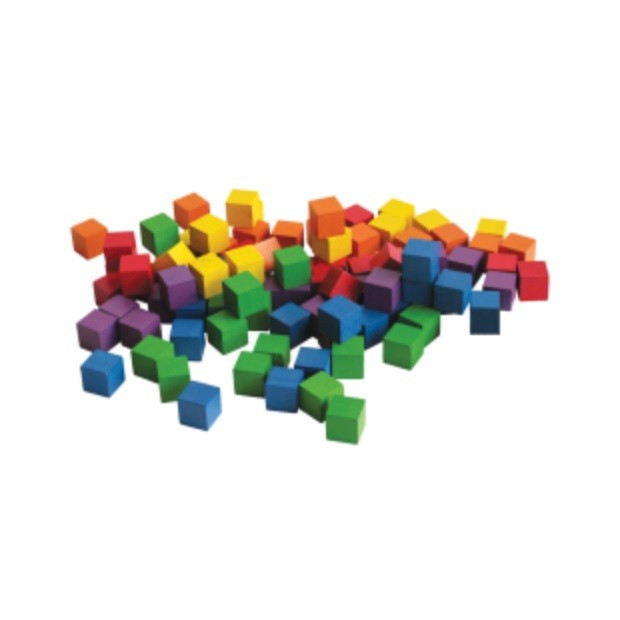 Dřevěné kostky s hranou o velikosti 2,5cm v jasných barvách pro bezpočet využití při výuce.