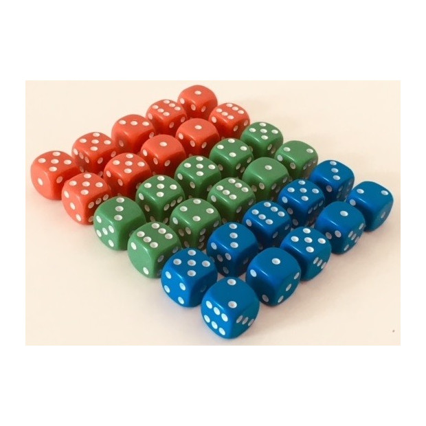 SADA HRACÍCH KOSTEK pro žáky do lavice - hrací (házecí) kostky pro žáky do lavice ve třech barvách s bílými puntíky a dostatečnou velikostí pro snadnou manipulaci. Kostky mají zaoblené rohy, aby se snadno kutálely a byl zaručen prvek náhody.