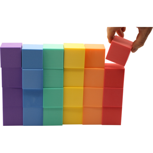 Sada obsahuje 24 kostek o délce strany 5 cm, vyrobených z pěnové plastické hmoty. V každé sadě je vždy po 4 kostkách od každé ze šesti barev: červené, modré, žluté, zelené, oranžové, fialové.