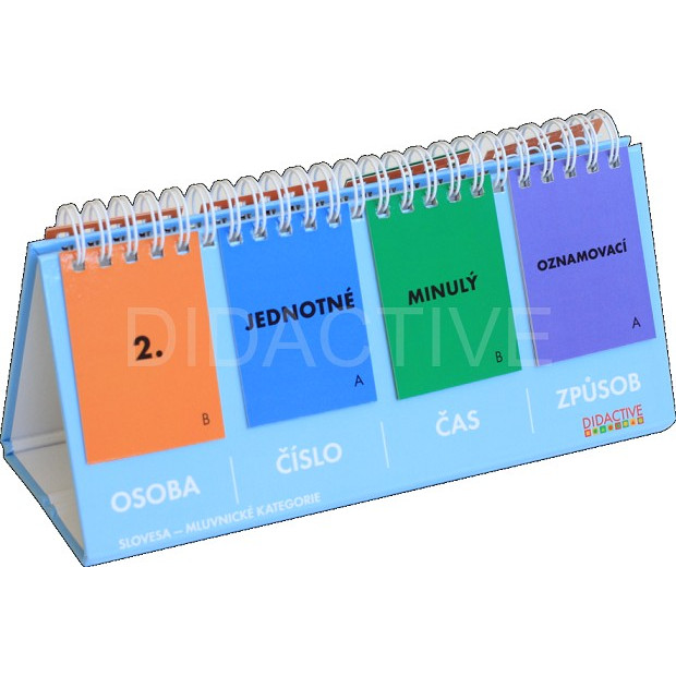 Počítadlo „kalendářové“ konstrukce o velikosti A5 s kartičkami pro jednotlivé mluvnické kategorie podstatných jmen: osoba, číslo, čas a způsob. K počítadlu doporučujeme i sadu příkladů (č. 15663). Při určování slovesného tvaru si pak žák může zkontrolovat správnost pomocí kódu na kartičkách počítadla a na rubu karty s příkladem.