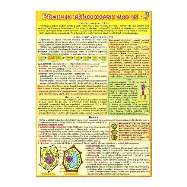 - kapitoly: Přírodopis jako věda, Organismy a jejich členění, Viry, Buňka, Jednobuněčné organismy (Bakterie a sinice, Řasy, Prvoci, Kvasinky), Houby (Nižší houby, Vyšší houby, Lišejníky), Mnohobuněční živočichové (Žahavci, Ploštěnci, Hlísti, Měkkýši, Kroužkovci, Ostnokožci, Členovci, Strunatci), Vyšší rostliny, Kořen, Stonek, List, Květ, Plod, Pletiva, Výtrusné rostliny (Mechorosty, Kapraďorosty), Semenné rostliny (Nahosemenné, Krytosemenné)