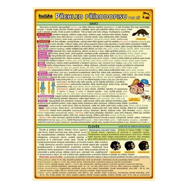- kapitoly: Savci (Vejcorodí, Živorodí), Člověk, Stavba těla člověka (Soustava opěrná, pohybová, dýchací, trávicí, vylučovací, oběhová a imunitní, kožní, hormonální, smyslová, rozmnožovací, nervová), Genetika, Země (Stavba Země, Utváření zemského povrchu, Vývoj Země, Nerosty, Horniny)