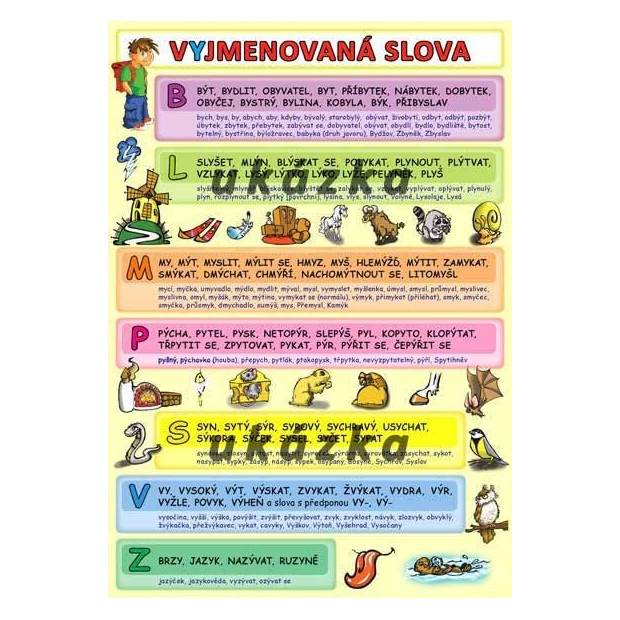 Přehledně zpracovaná ilustrovaná vyjmenovaná slova a slova od nich odvozená doplněná pravopisnými významovými rozdíly v praktickém formátu A5.