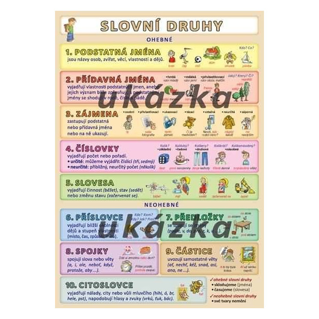 Přehledně zpracované slovní druhy včetně příkladů a názorných ilustrací.