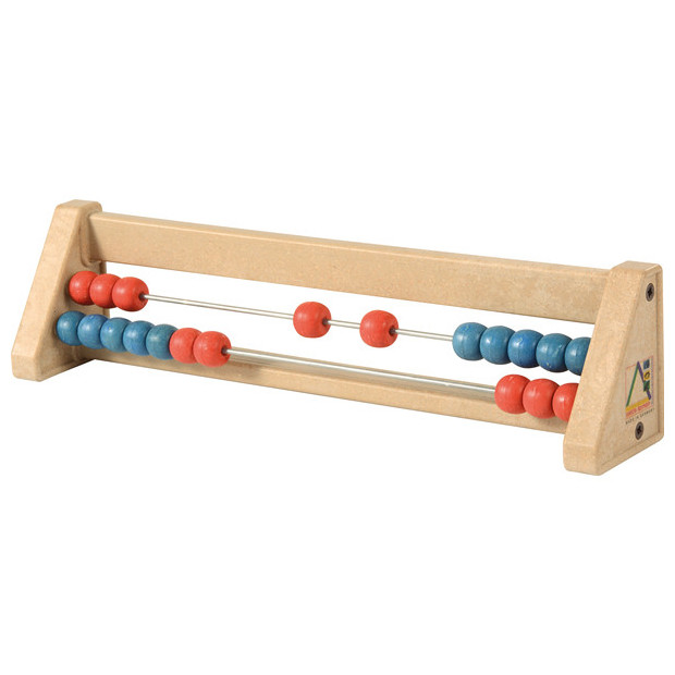 Bytelný stojánek se dvěma řadami kuliček. Stojánek je 6cm vysoký a 25cm široký. Korálky mají průmr cca 12mm. Korálky jsou ve dvou barvách - červené a modré - a barvy se střídají po 5 kuličkách.