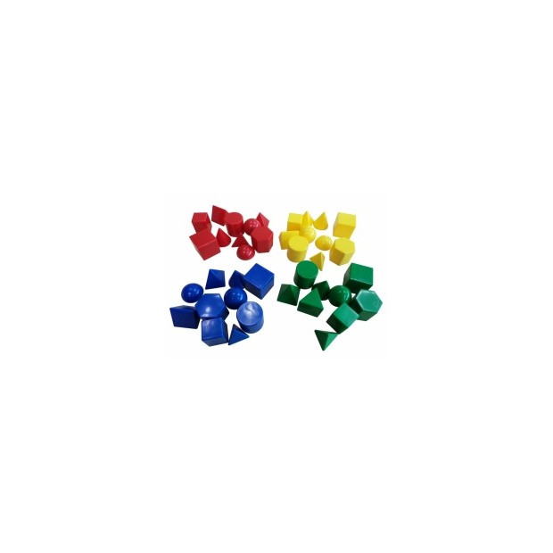 Sada obsahuje 40ks plastových těles o velikosti 2,5cm: 10 základních těles - krychli, trojboký, čtyřboký a šestiboký hranol, kužel, trojboký a čtyřboký jehlan, válec, kouli a polokouli vždy ve 4 barvách - červené, modré, žluté a zelené.
