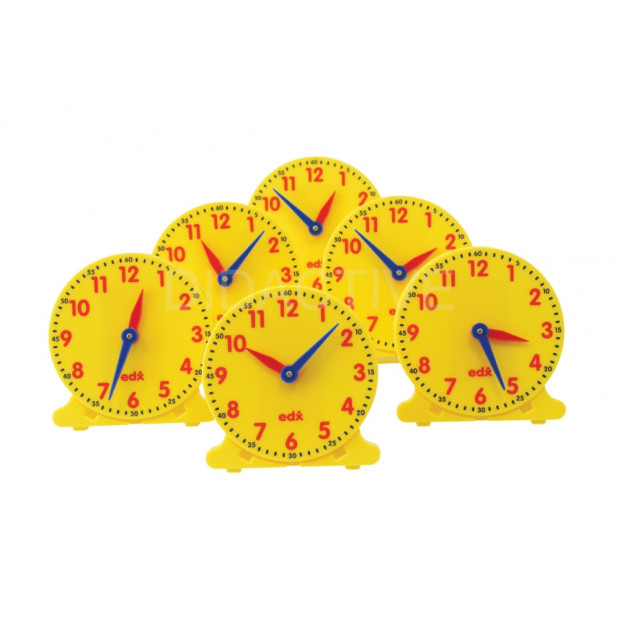 Balení obsahuje 6ks hodin z trvanlivého pevného plastu. Na žlutém ciferníku jsou zobrazeny hodiny (1 - 12) a minuty (0 - 60). Modrá minutová ručička je s červenou hodinovou ručičkou propojena mechanismem tak, že při otáčení knoflíkem na zadní straně se ručičky otáčejí ve stejném poměru, jako reálné hodiny, tj. červená ručička se otočí o jednu hodinu za jednu celou otočku modré ručičky odpovídající 60 minutám. Průměr ciferníku hodin je 10,5 cm. K dispozici je stojánek pro postavení hodin na lavici.