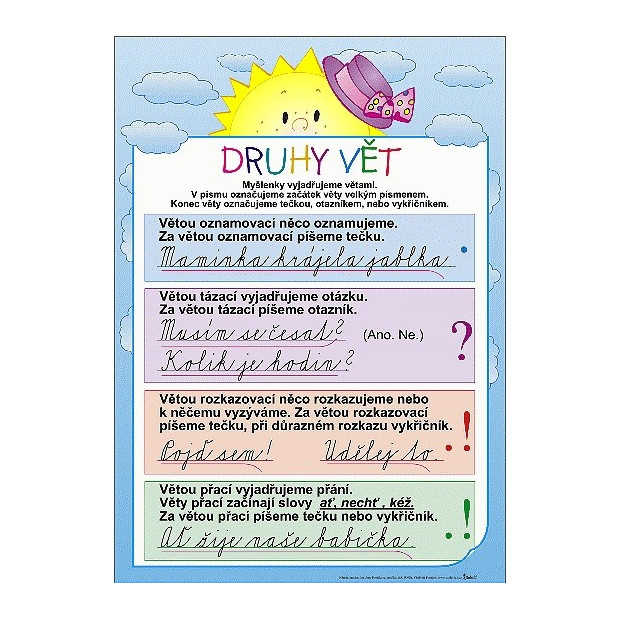 Obrázek s tabulkou přehledně ukazuje druhy vět včetně příkladů a znázornění intonace.