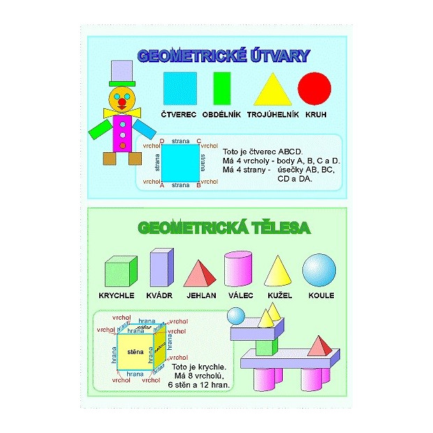 Přehledný výčet základních geometrických útvarů a těles znázorňující i pojmy strana, vrchol, hrana, stěna.