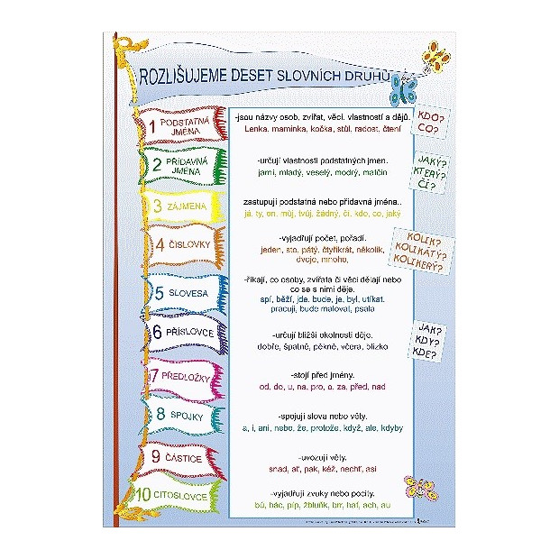 Přehled slovních druhů v obrázku, včetně příkladů.