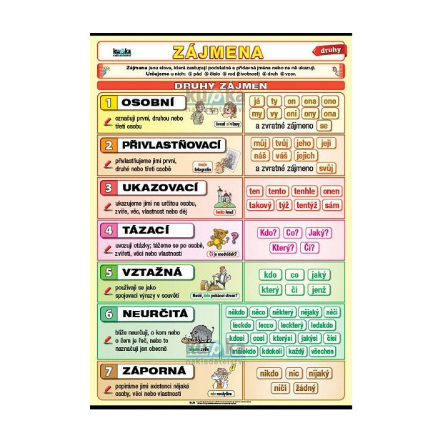Nástěnný obraz pro výuku českého jazyka - druhy zájmen - vhodný pro všechny typy škol i k domácímu využití.