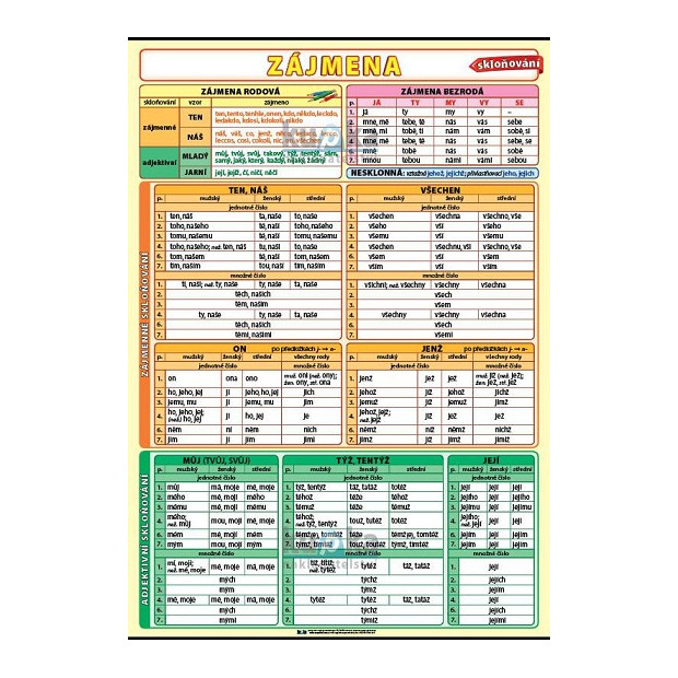 Nástěnný obraz pro výuku českého jazyka - skloňování zájmen - vhodný pro všechny typy škol i k domácímu využití.