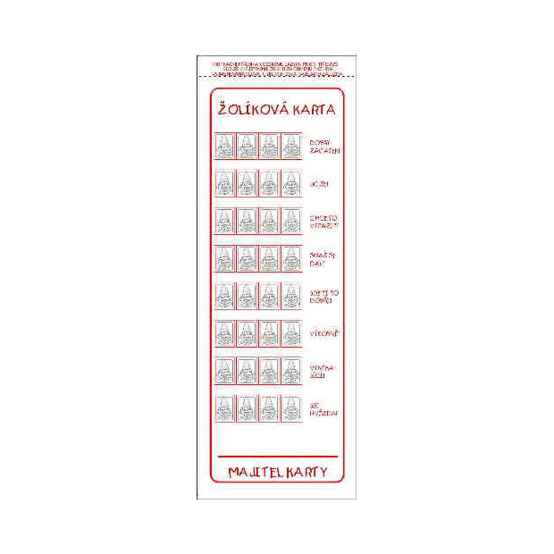 Žolíková karta je z tvrdého papíru a slouží jako záložka a k dolepování jednotlivých žolíků.