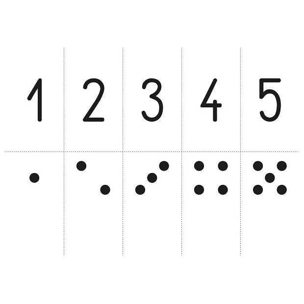 Soubor karet určených k rozstříhání zahrnuje arabské číslice 0–9, čísla 10–20, čísla 1–10 znázorněná tečkami a symboly +, −, <, >, =.